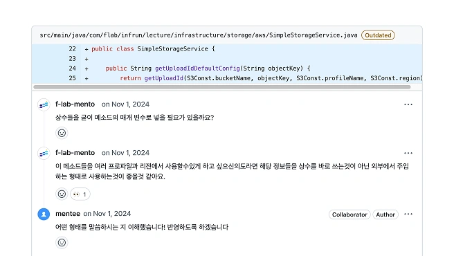 에프랩은 멘티 개인의 학습 수준과 방식에 맞춰 1:1로 멘토링을 진행하고 있습니다. 이를 통해 꾸준히 깊이있는 학습 습관을 기를 수 있으며, 멘토링이 종료되고 나서도 스스로 성장할 수 있는 기반을 갖추게 됩니다.