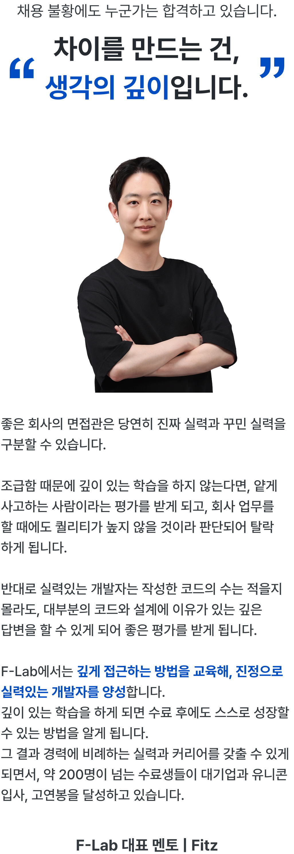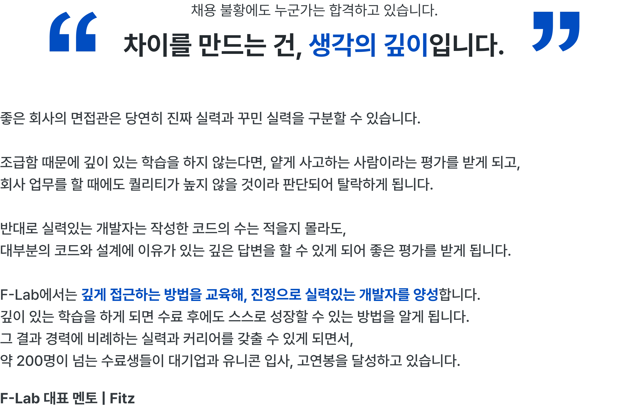 F-Lab을 수료생들은 대기업 혹은 높은 연봉을 받는 개발자로 활약하고 있습니다.